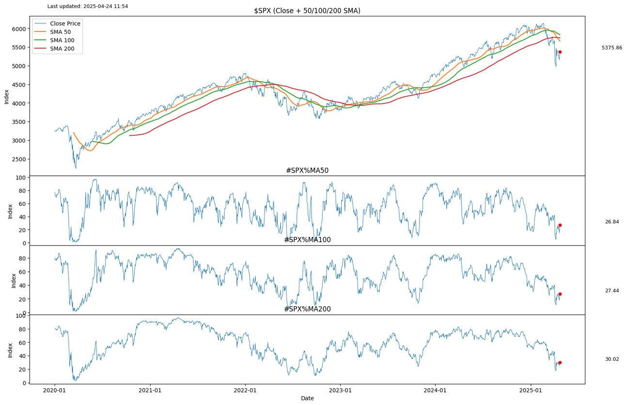 Here is a slightly different take; you can see the S&P 500 against its own 50, 100, & 200-day moving averages. It is still below all 3.