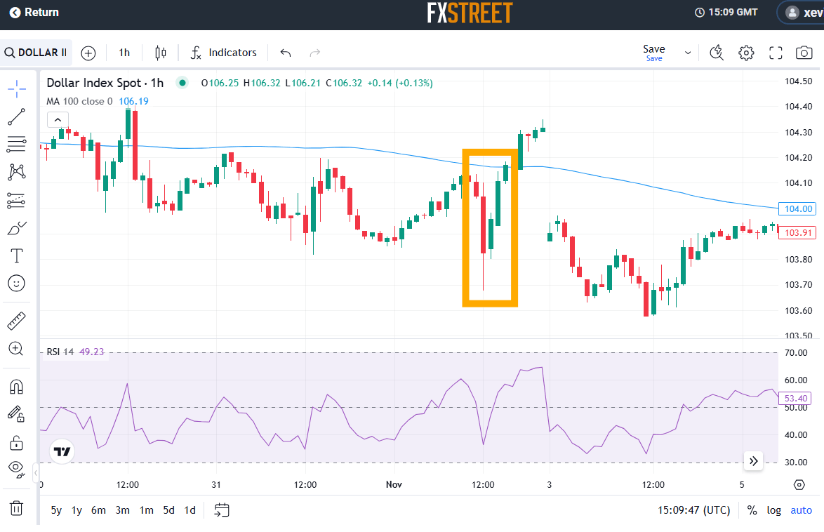 The valuation of the DXY US Dollar Index, which measures the value of the US Dollar against a basket of foreign currencies, fell on November 1 within the following hour after the NFP release as the headline payrolls number came in way lower than expected. However, traders quickly turned around afterward and the DXY recovered its pre-NFP-release level around two hours later.