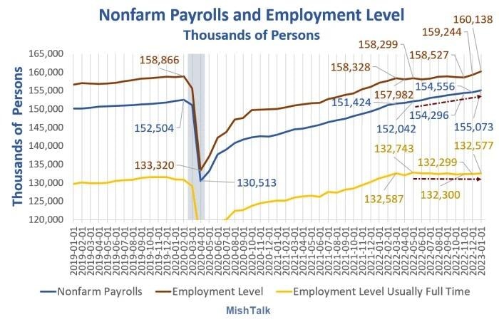 Payrolls vs Employment Since May 2022