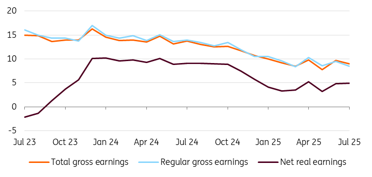 Additionally, inflation is uncomfortably high. While government measures can statistically moderate the pace of price increases, households continue to perceive inflation as too high. Therefore, even though the purchasing power of wages grew by 4.9% YoY in July, consumers are saving a larger portion of their marginal income than historically would. Consequently, while rapid wage growth improves the financial situation of households, it does not help the real economy grow as much as these figures suggest.