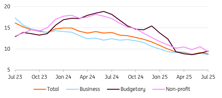 We expect average annual wage growth of between 8-9% for the economy as a whole in 2025, which is a slight upward revision of our forecast. However, weak and declining business confidence indices pose a downside risk, which may be joined by labour cost rationalisation.