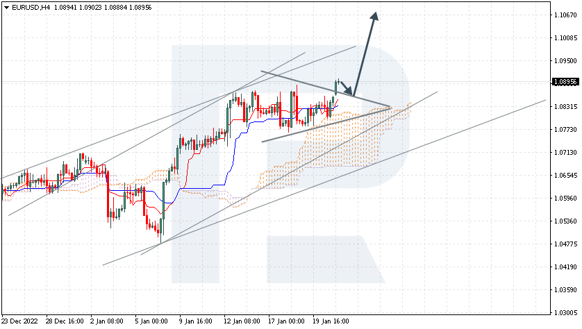 The currency pair has secured above the upper border of the Triangle pattern. The instrument is going above the Ichimoku Cloud, which suggests an uptrend. A test of the Tenkan-Sen line at 1.0855 is expected, followed by growth to 1.1065. An additional signal confirming the growth will be a bounce off the upper border of the Triangle pattern. The scenario can be cancelled by a breakaway of the lower border of the Cloud and securing under 1.0635, which will mean further falling to 1.0545.