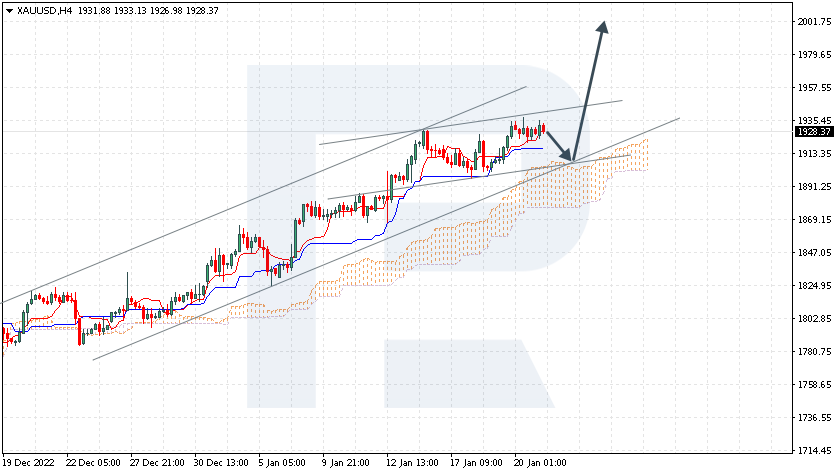 Gold is pushing off the Kijun-Sen line of the indicator. The instrument is going above the Ichimoku Cloud, which suggests an uptrend. A test of the upper border of the Cloud at 1910 is expected, followed by growth to 2000. An additional signal confirming the growth will be a bounce off the lower border of the bullish channel. The scenario can be cancelled by a breakaway of the lower border of the Cloud and securing under 1865, which will mean further falling to 1835.
