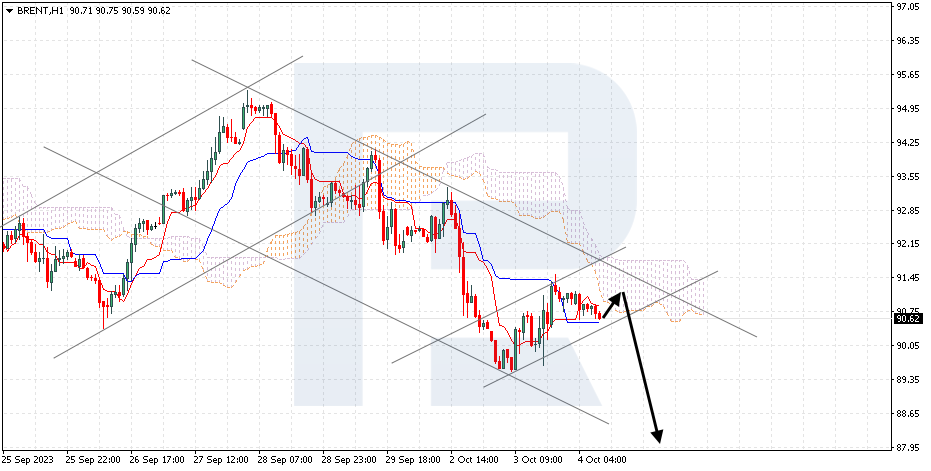 Brent is declining within a bearish channel. The instrument is going below the Ichimoku Cloud, which suggests a downtrend. A test of the lower boundary of the Cloud at 90.95 is expected, followed by a decline to 87.95. An additional signal confirming the decline will be a rebound from the upper boundary of the bearish channel. The scenario can be cancelled by a breakout of the upper boundary of the Cloud with the price securing above 92.25, which will mean further growth to 94.65. Meanwhile, the decline could be confirmed by a breakout of the lower boundary of the bullish channel with the price securing under 89.65.