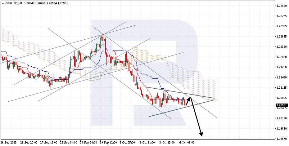 GBPUSD is correcting within a Triangle pattern. The instrument is going below the Ichimoku Cloud, which suggests a downtrend. A test of the Kijun-Sen line at 1.2080 is expected, followed by a decline to 1.1965. An additional signal confirming the decline will be a rebound from the upper boundary of the descending channel. The scenario can be cancelled by a breakout of the upper boundary of the Cloud with the price securing above 1.2175, which will mean further growth to 1.2265. Meanwhile, the decline could be confirmed by a breakout of the lower boundary of the Triangle pattern with the price securing under 1.2040.