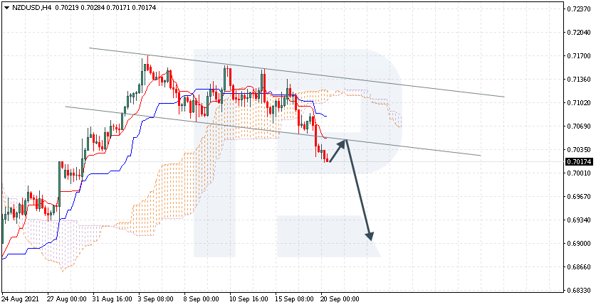 NZDUSD is trading at 0.7017; the instrument is moving below Ichimoku Cloud, thus indicating a descending tendency. The markets could indicate that the price may test Tenkan-Sen and Kijun-Sen at 0.7040 and then resume moving downwards to reach 0.6905. Another signal in favor of a further downtrend will be a rebound from the descending channel’s downside border. However, the bearish scenario may no longer be valid if the price breaks the cloud’s upside border and fixes above 0.7145. In this case, the pair may continue growing towards 0.7235.