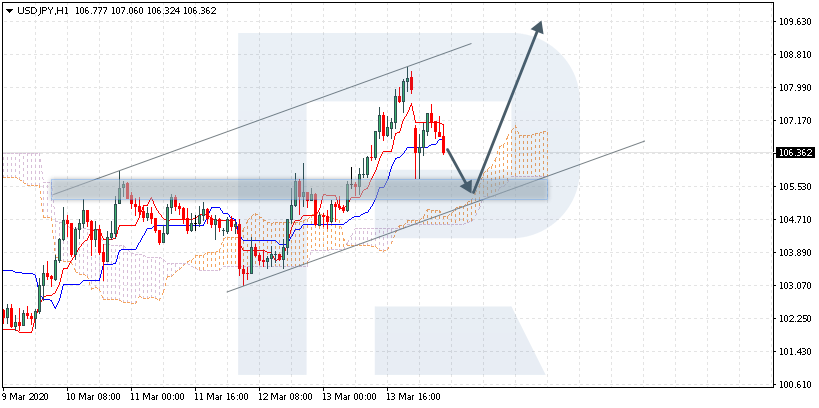 USDJPY is trading at 106.36; the instrument is moving above Ichimoku Cloud, thus indicating an ascending tendency. The markets could indicate that the price may test the cloud's upside border at 105.35 and then resume moving upwards to reach 109.65. Another signal to confirm further ascending movement is the price's rebounding from the rising channel's downside border. However, the scenario that implies further growth may be canceled if the price breaks the cloud's downside border and fixes below 103.85. In this case, the pair may continue falling towards 101.65.