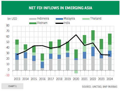 Asia is the leading recipient of foreign direct investment. East and South Asia is the leading recipient of foreign direct investment (FDI) among emerging countries (59.9% of the total in 2024), a level commensurate with their weight in the global economy. According to UNCTAD, apart from China and Singapore (a financial centre through which capital transits), India, Indonesia and Vietnam were the main recipients of FDI in emerging Asia in 2024 (Chart 1).