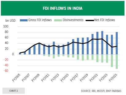 India, a major recipient of gross FDI, is unable to retain it. Between 2017 and 2024, gross FDI inflows into India increased by a factor of 1.3, while disinvestments increased by a factor of nearly 2.9 (Chart 2). Foreign companies sold their assets or repatriated their earnings without reinvesting them in the country.