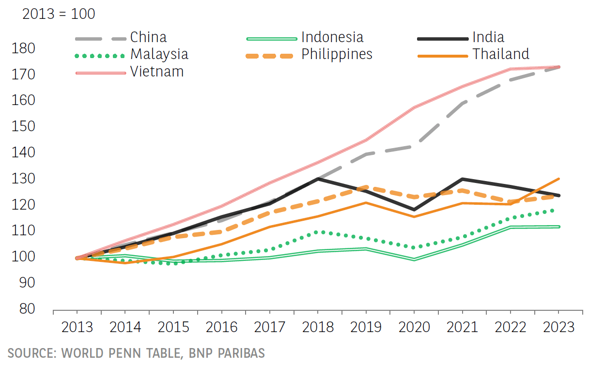 Between 2013 and 2018, India experienced robust productivity growth (increasing by a factor of 1.3, comparable to Vietnam, slightly lower than China, and higher than Indonesia, Malaysia, the Philippines and Thailand). However, from 2019 onwards, productivity in India has stagnated, while it has continued to rise in other countries (with the exception of the Philippines). This trend is particularly concerning given that GDP per capita remains low (in PPP, it was 2.4 times lower than that of China in 2024) and unemployment is high, especially among young people (15.6% in 2024 according to official data). Without a rapid increase in productivity, India could remain a ‘middle-income’ country.