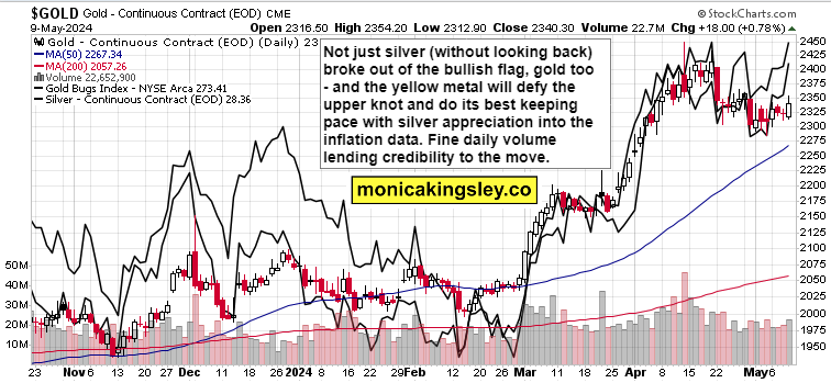 The technical development is that following marginally higher high with indecision, stocks rose through 5,215 resistance on the rate cuts (still just 50% odds for Sep, but salivation for Jul is palpable), and decisively – best played in intraday terms. Equities though couldn‘t have beaten the great silver move called.