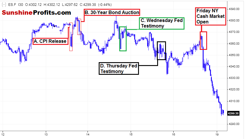 On Friday, we got a bullish Retail Sales number at 8:30 AM before the NY cash open, and then a bearish UoM Consumer Sentiment Print at 10:00 AM. The NY open was lower even before the bearish UoM print at 10:00 AM. It seemed like the index finally couldn’t bear the inflation data. The weak bond auction, and the congressional rhetoric during the Fed 2-day testimony any further and had to break. It actually made sense.