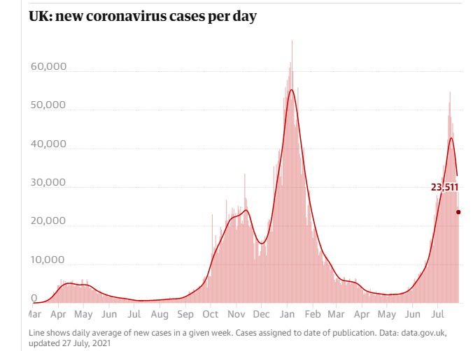 Britain, which has close ties to India, was one of the first countries to struggle with Delta and decided to delay its grand reopening of the economy by one month. However, it seems like the first Western country to see infections falling at a similarly rapid clip to the one they rose. The UK reported seven consecutive days of falls in cases.