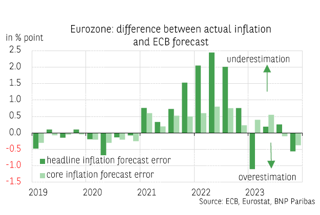 The spike in inflation in 2021 and 2022 surprised everyone, leading to large forecast errors. We are reproducing here a graph coming from a presentation by Philip Lane on the ECB’s forecast errors for euro area inflation[1]. The maximum error of 2.4 points was made in Q2 2022: it corresponds to the difference between the actual headline inflation print for that quarter (8% year-on-year) and the ECB’s March 2022 forecast for Q2 2022 (5.6% y/y). The ECB then continued to underestimate inflation, but less and less so, before overestimating it in Q1 and Q4 2023 for the headline measure (-1.1 and -0.6 points respectively) and in Q3 and Q4 2023 for the core measure (-0.1 and -0.4 points respectively).