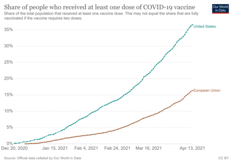 Let’s analyze the most traded pair – EUR/USD. At the first sight, the US is doing better than the Euro Area. The percentage of vaccinated people is much higher in the US than in the EU. Elsewhere, after problems with AtraZeneca’s vaccine, Johnson & Johnson stopped sending its vaccine to the EU as well because of the possible negative side effects.