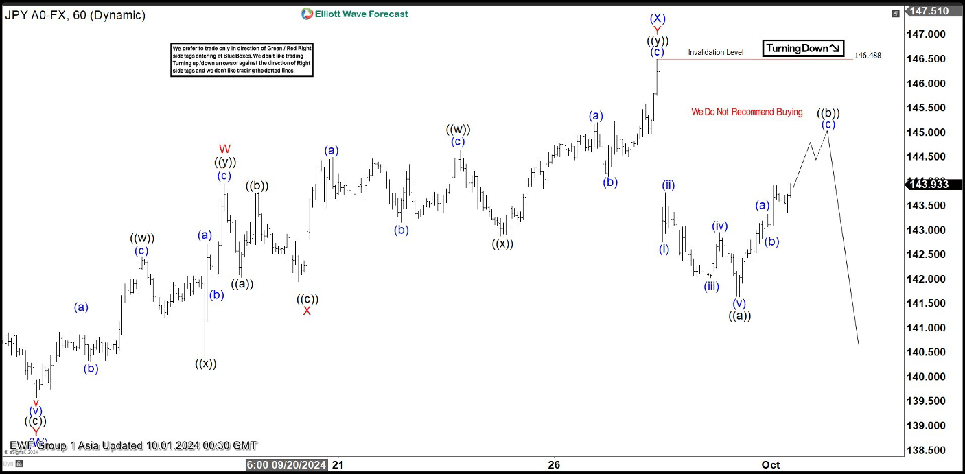 Short term Elliott Wave View in USD/JPY suggests decline to 139.57 ended wave (W). Pair then corrected in wave (X) with internal subdivision as a double three Elliott Wave structure. Up from wave (W), wave ((w)) ended at 142.46 and pullback in wave ((x)) ended at 140.43. Rally in wave ((y)) ended at 143.94 which completed wave W in higher degree. Pullback in wave X ended at 141.73 with internal subdivision as a zigzag structure.