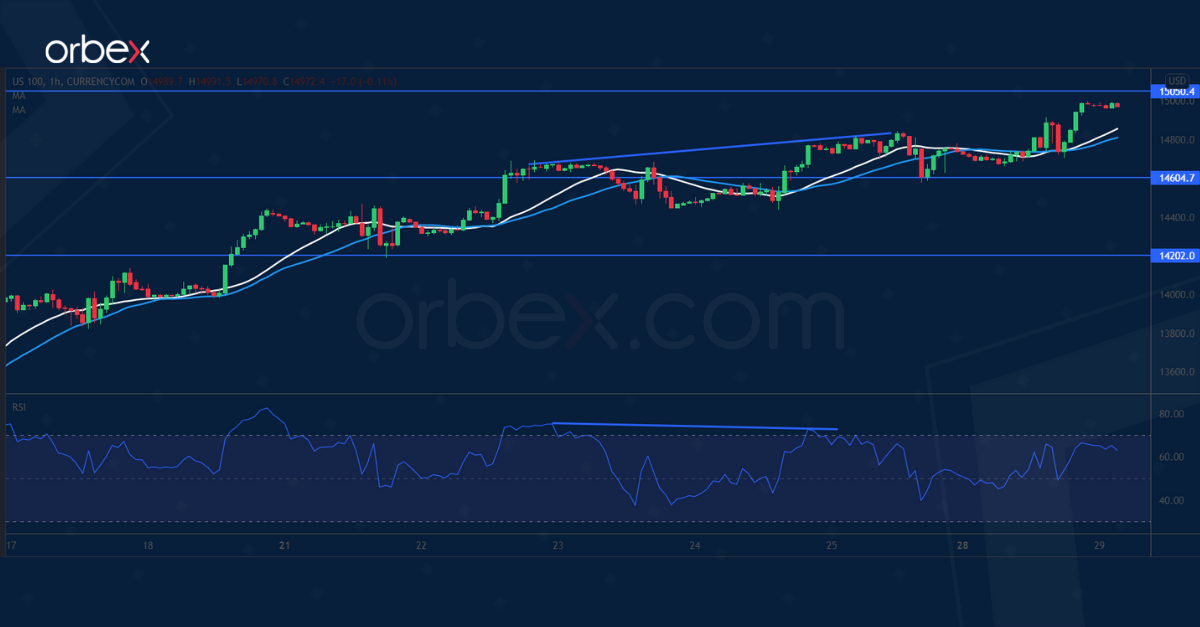 The Nasdaq 100 is heading to the daily resistance at 15050. A bearish RSI divergence suggests a deceleration in the rally, foreshadowing a potential retracement.