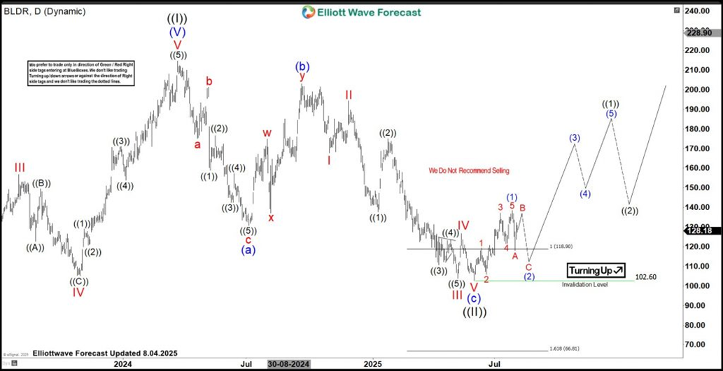 BLDR was corrected more than 50 % since all time high of $214.70 in June-2025 low. It ended correction of ((II)) at $102.60 in 6.02.2025 low in daily extreme area. Above there, it favors upside in next cycle or at least larger 3 swings bounce. We like to remain long from the daily extreme area against 6.02.2025 low.