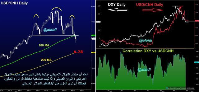 On Dec 6th, I posted a chart of the USD/CNH (US dollar vs the Chinese offshore yuan), showing a striking Head & Shoulders formation. 33 days later, the H&S formation is 95-98% complete after USD fell against all major currencies. This also coincides with 10% drop in DXY from its highs. There's that "new" saw in FX about USDCNH or USDCNY becoming the new USDJPY. Regardless, 6.78 on USDCNH represents a nearly complete H&S formation. Does that mean USD has bottomed for now? Does its coincide with a USD recovery on Thursday's release of US CPI? Or, will we see a correction during the 1-2 days before CPI, followed by fresh declines. What does it portend for any coinciding technicals with gold and indices?