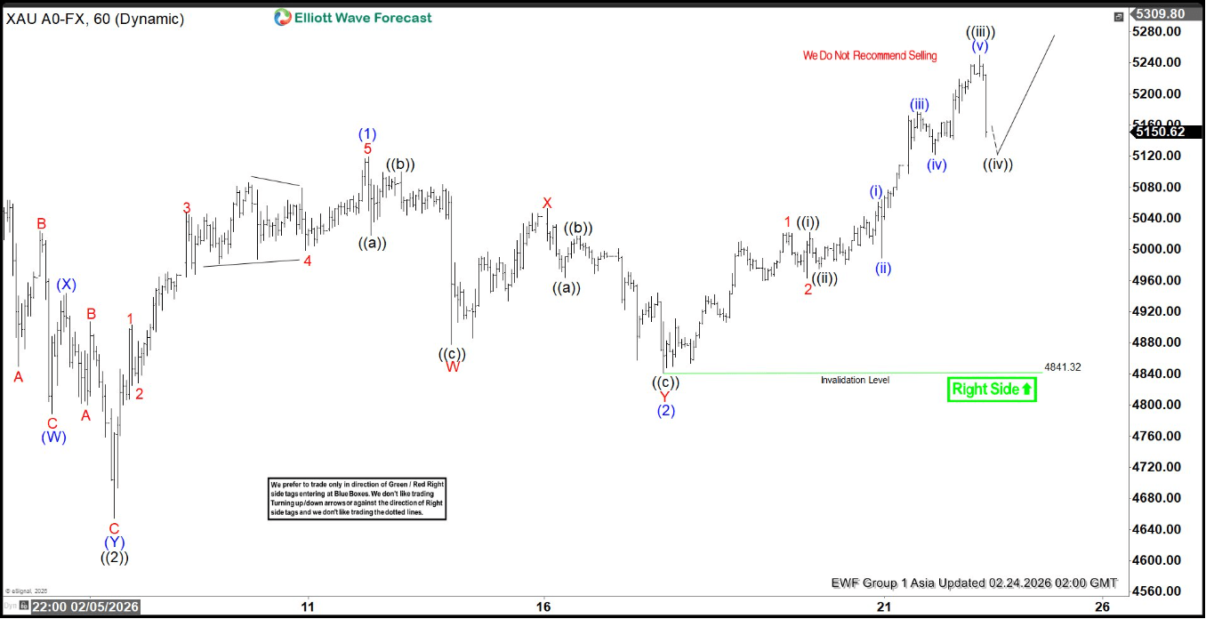 From the February 2 low, wave ((1)) concluded at $5091.95, while the subsequent decline in wave ((2)) found support at $4655.30, as illustrated on the one-hour chart. Following this, the market advanced into wave ((3)), which itself nested higher. Within wave ((3)), wave (1) terminated at $5119.16, and the corrective pullback in wave (2) ended at $4841.32. The internal subdivision of wave (2) unfolded as a double three Elliott Wave pattern. Specifically, wave W declined to $4877.75, wave X rallied to $5053.11, and wave Y completed at $4841.32. This sequence finalized wave (2) at a higher degree, setting the stage for renewed strength.