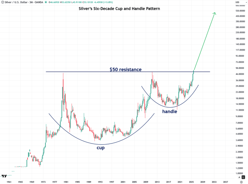 This silver cup-and-handle pattern has played out over an extremely long timeframe. Historically, longer patterns portend bigger breakouts with a broader base signaling a bigger upside case.