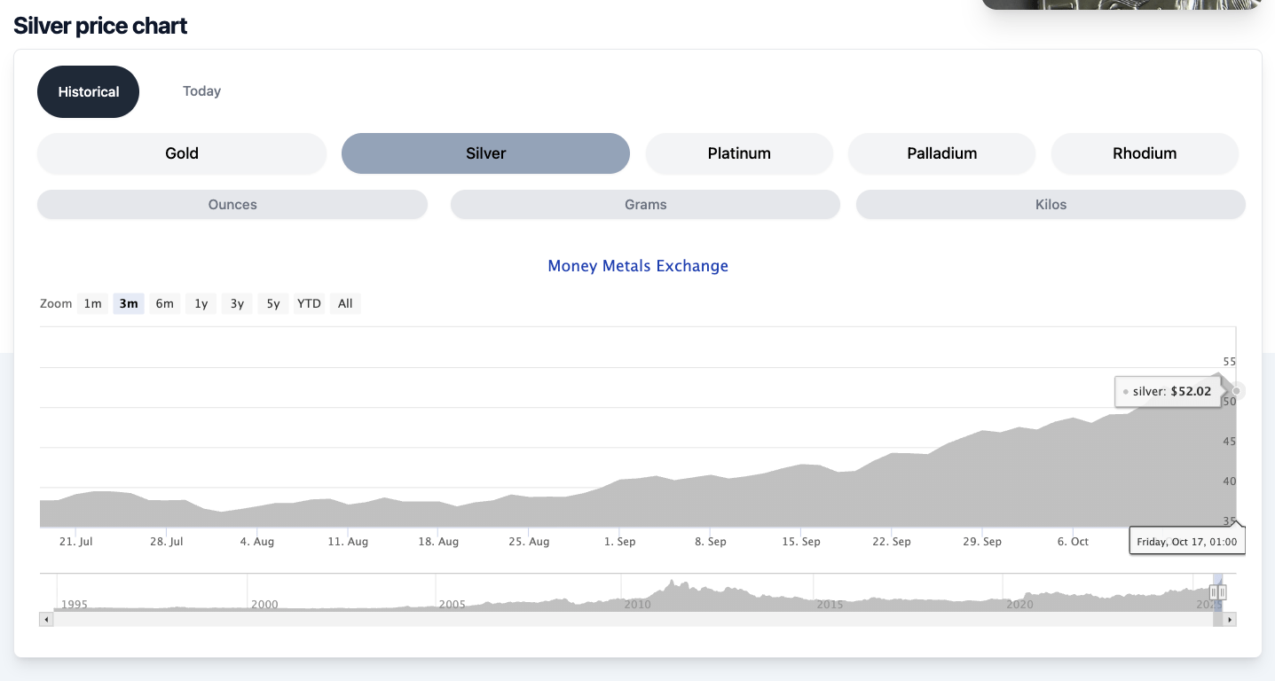 On September 18, silver was trading at $41.83. Over the next three weeks, silver rose to $54.32 an ounce, a 29.6 percent increase. It has since corrected, falling to $52 on Friday. But on Monday, the bulls were back in control, pushing silver back to $52.75.