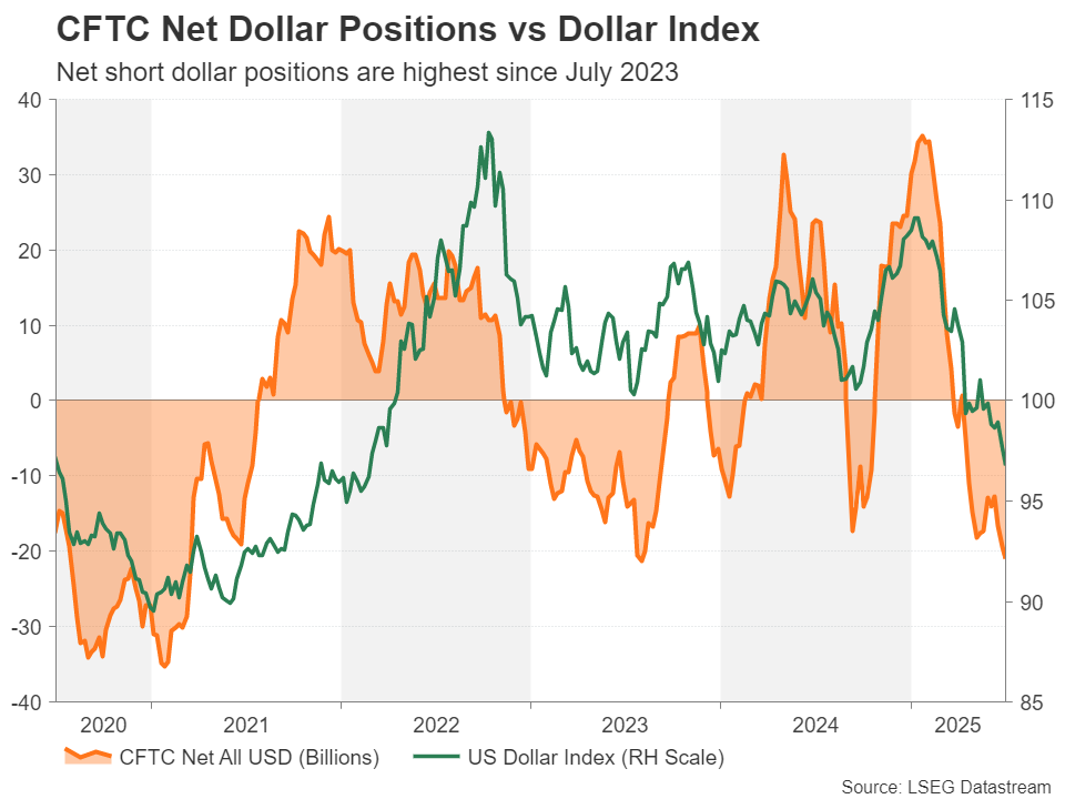 So, it’s an all-round bearish picture for the dollar, whichever way the trade war plays out. The key question now is, how much lower can the dollar go? Large traders are the most bearish on the dollar since July 2023 according to CFTC data, suggesting that the downtrend may be nearing its end. Although historically, the net short positions don’t look too overcrowded.