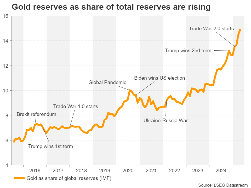 More concerning is the acceleration of de-dollarization by several, mainly emerging market countries, like China and Russia, in an effort to reduce their dependence on the US economy as well as become less vulnerable to sanctions by Washington. The dollar’s share of global reserves has fallen from over 70% at the turn of the century to just under 60% in 2024.