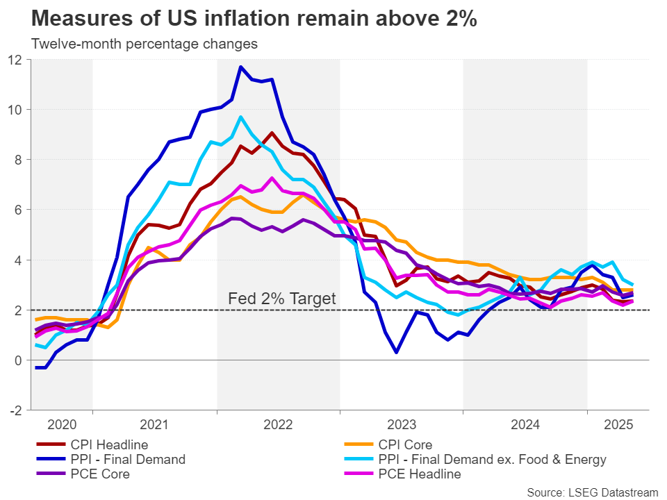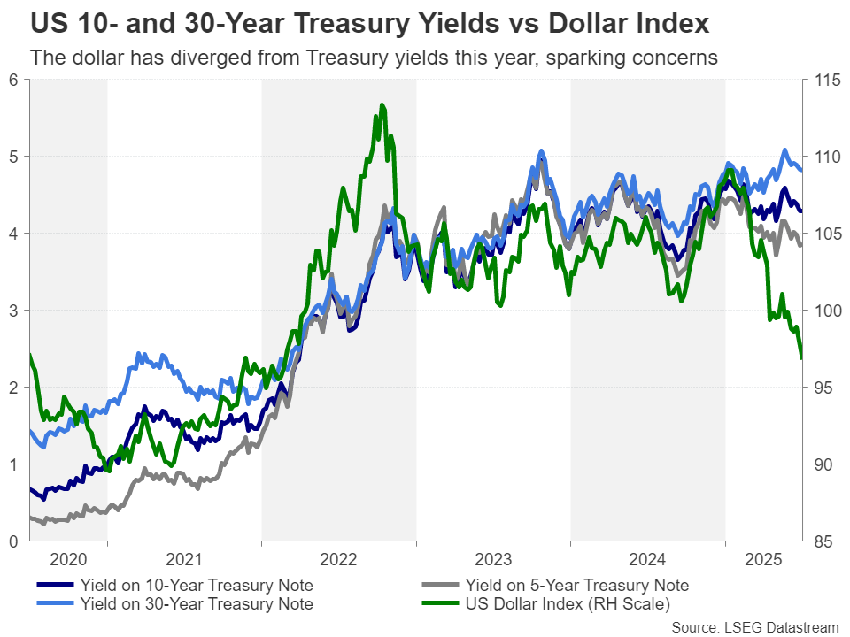 This “risk premium” of Trump’s presidency can be seen quite clearly when looking at the divergence between the US dollar and Treasury yields. The dollar has been in freefall since January, initially tracking the decline in yields. But US yields started to edge up once Trump launched his “Trade War 2.0”, as investors priced in fewer Fed rate cuts on the expectation that higher tariffs will revive inflation. Trump’s radical policies have also dented demand for Treasury bonds, further driving yields higher.
