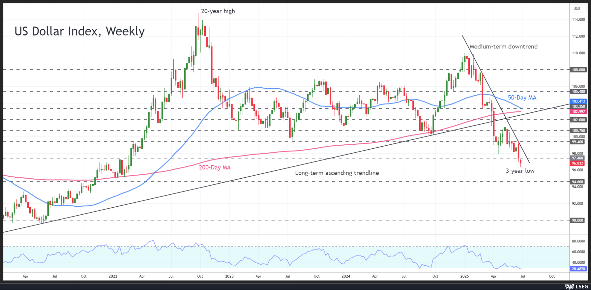 America’s twin deficit problem is another long-running headache for the greenback. The Republican-led Senate just passed a tax and spending bill that looks set to add more than $3 trillion to America’s debt pile. And with investors not hopeful that Trump’s trade policies will slash the country’s massive trade deficit, the dollar is looking like a risky bet right now.