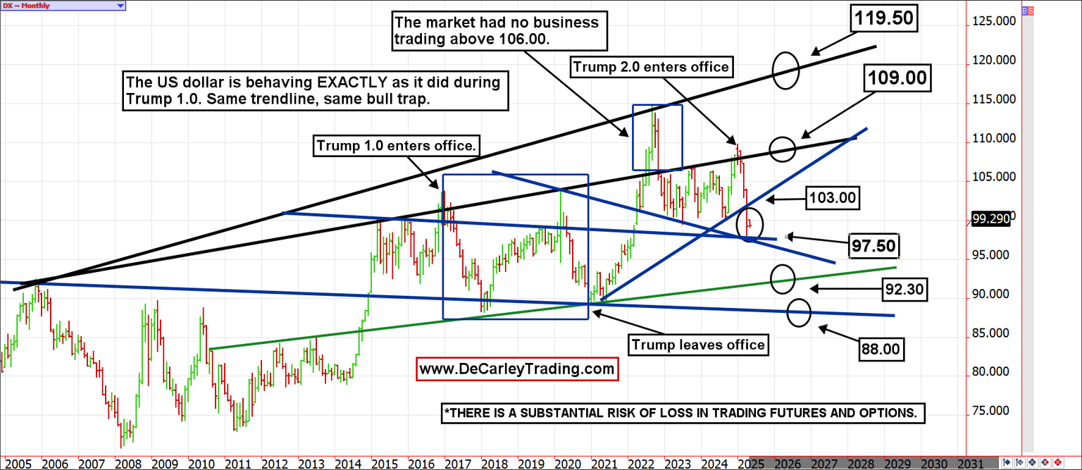 Despite what has been touted as disbelief in how the currency markets have behaved during Trump 2.0, we are precisely following the path of the dollar during the last time Trump was in office. The same monthly uptrend line rejected the dollar index, leading to a slide into the high-80.00s. I suspect we get a repeat of that, but even that wouldn’t be cause for alarm or a reason to shop for an alternative reserve currency. Instead, it would level the playing field for US farmers, small businesses, and manufacturers. It would work against the trade deficit and favor our middle class. Yes, please!