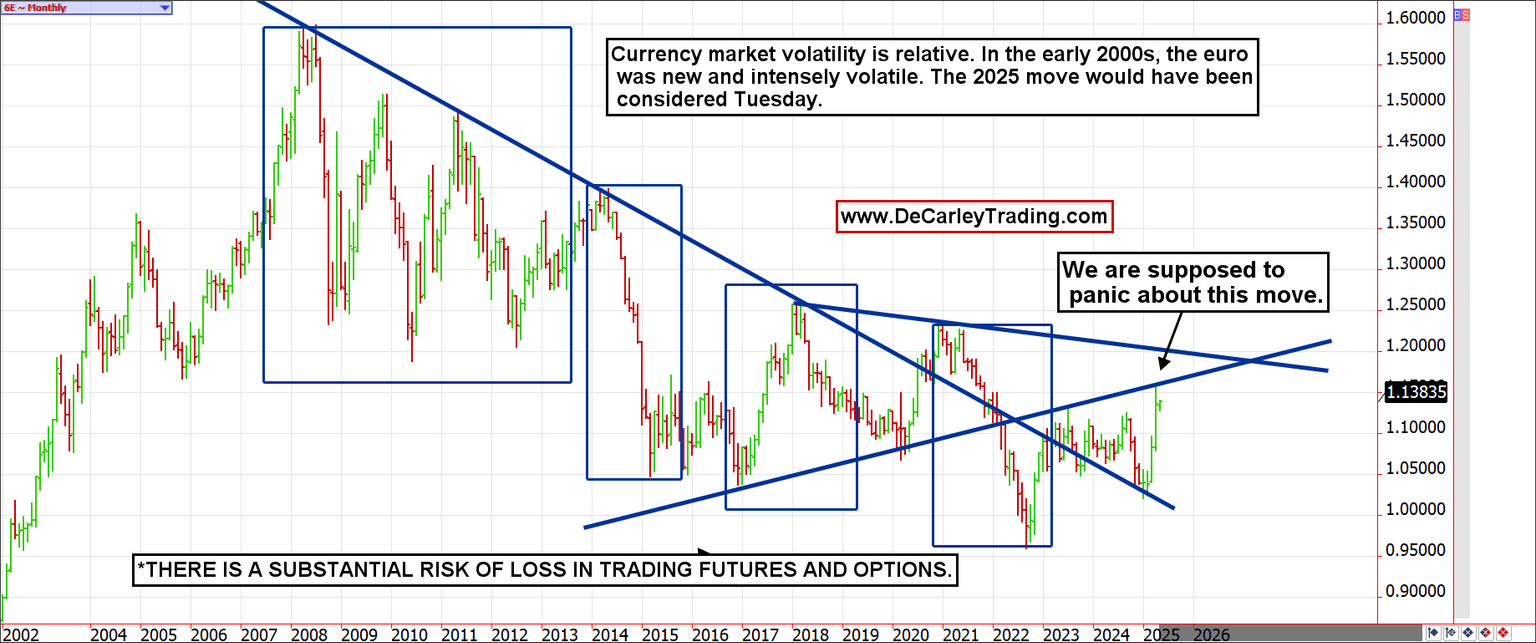 Currency market volatility is relative. We are coming off a few years of slumber, but that was the exception, not the norm. The 2025 volatility is child’s play compared to any time frame other than 2023 to 2024. Don’t let the headlines tell you how to feel. A monthly chart tells a more complete story; this is what the euro currency has looked like over the last 20+ years.
