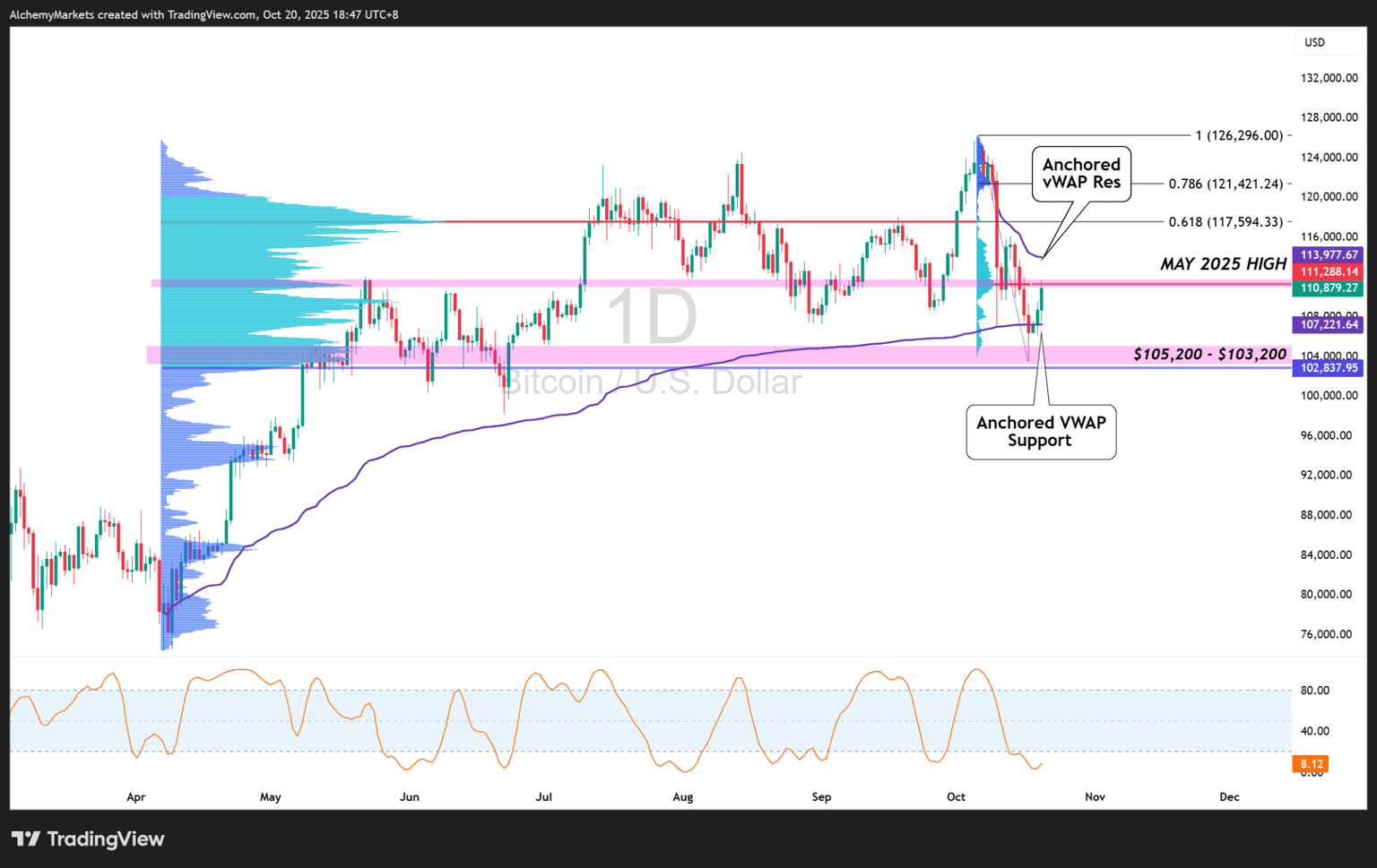 Bitcoin has already reacted to a high-volume node near $103,200, and more importantly, has reclaimed a key Anchored vWAP from the start of its recent rally — currently at $107,221.64.