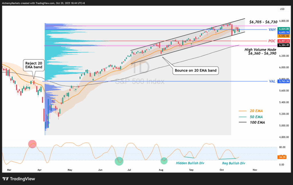 Using a Fixed Range Volume Profile (FRVP) to assess key levels, the S&P 500 is currently hovering around the Value Area High (VAH) of its recent rally. While this zone acts as resistance, several factors lean bullish: