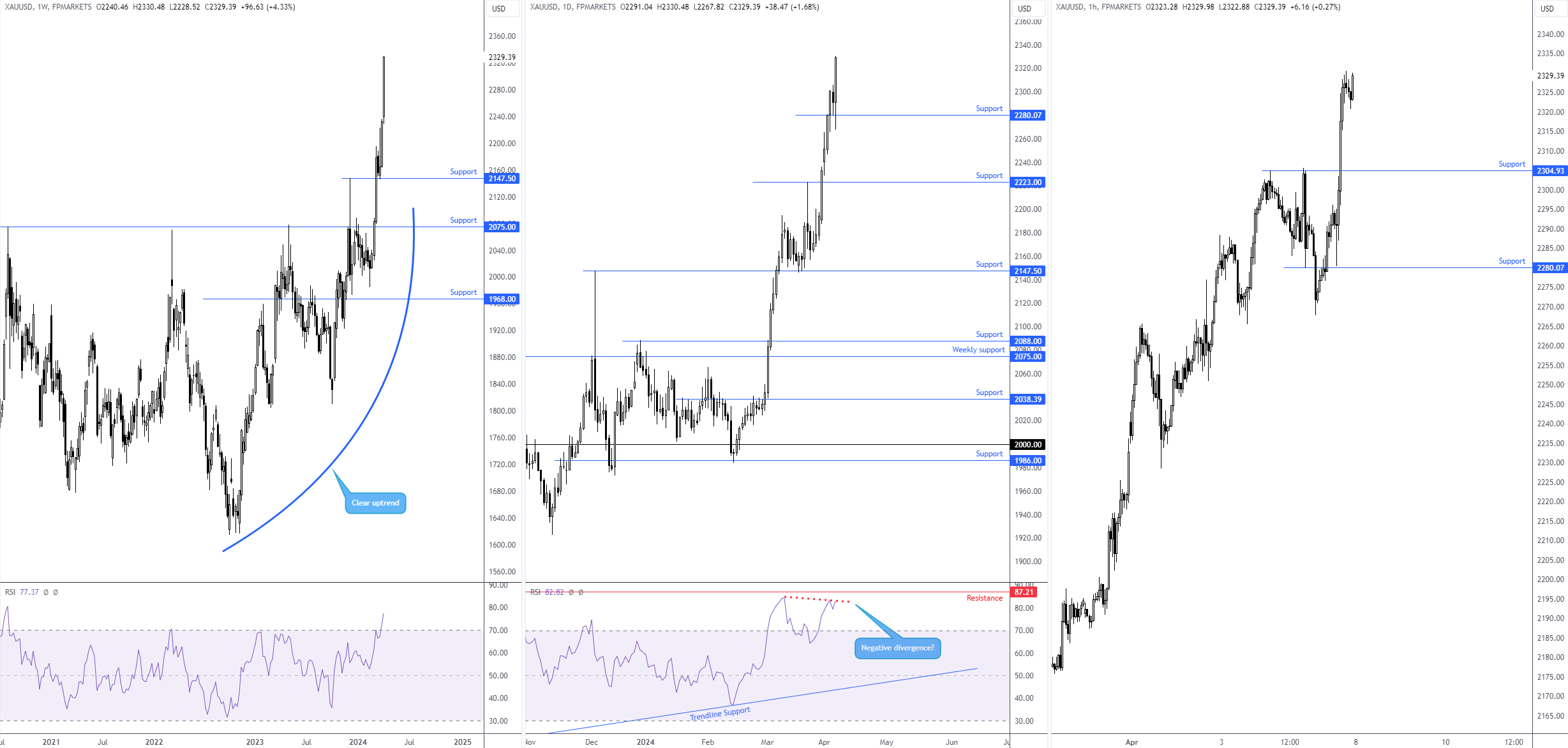 There’s no denying that the yellow metal is exhibiting an uptrend and has been since pencilling in a bottom around the $1,614 area in late 2022. Knowing we have a clear uptrend in the longer term (see weekly and daily charts) and are essentially void of any resistance, many traders/investors will be seeking out dip-buying opportunities. Now, in terms of support on the weekly and daily charts, the former shines the technical headlights towards $2,147 as possible support, but this would take a meaningful correction to reach. Meanwhile, on the daily scale, support is located at $2,280, with a break under here likely to see the yellow metal call in on support from $2,223.