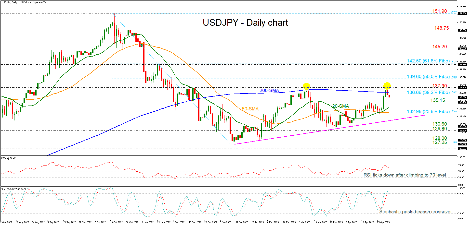 USDJPY plunged below the 200-day simple moving average (SMA) once again after the climb towards the 137.90 resistance level, which is acting both as a significant resistance level and a possible double top pattern is in progress. The pullback below the 38.2% Fibonacci retracement level of the down leg from 151.90 to 127.25 at 136.66 is indicating the start of a consolidation area in the medium-term timeframe.