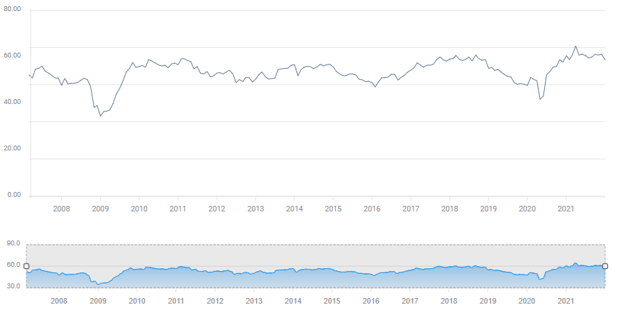 Manufacturing orders were one of the economic bright spots in 2021 averaging 64.6 for the 11 months to November. For many factory managers orders were a source of frustration as it became increasingly difficult for many businesses to find enough workers to maintain full production.