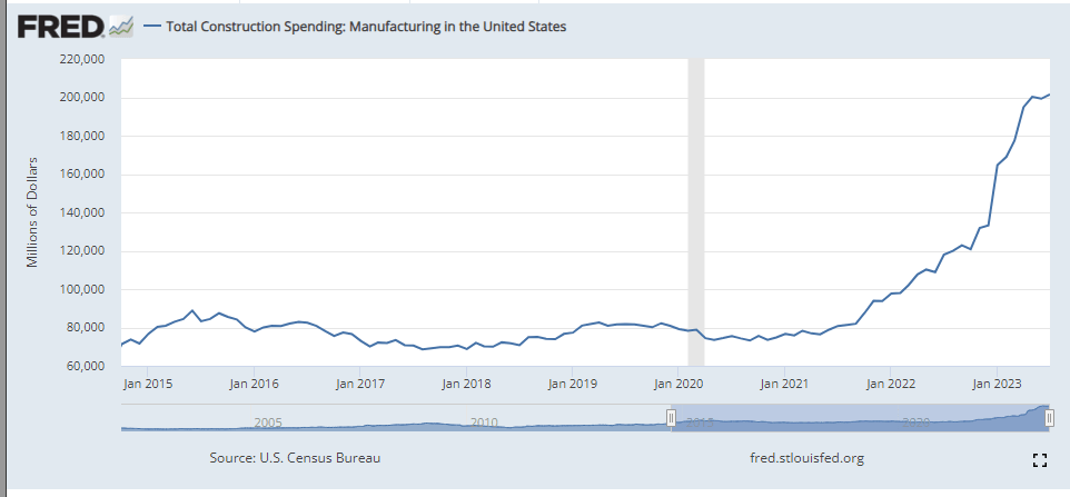 The IRA may not contribute to lowering inflation – pouring money does not tend to have that impact – but it turbo-charged manufacturing construction spending: