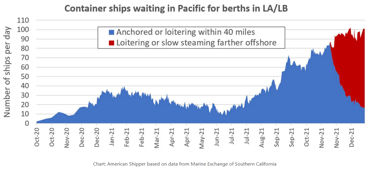 Bloomberg directs the reader to the American Shipper website which contains data and charts from the NY Fed, which launched a new index on Jan 5. The charts will curl your hair. One we like affirms that the metric of ships waiting to unload has fallen dramatically because they moved farther offshore. This has been widely reported but see the chart!