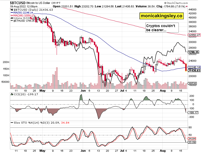 Following yesterday‘s weak rally and bonds showing, S&P 500 bears have the upper hand (timely announcement). Then, the crypto plunge is adding to downswing‘s credibility – about to spill over into tech. Note it didn‘t and doesn‘t take much of a dollar upswing – continuing the rise is enough. Yesterday‘s positive economic data are to be overshadowed by the Fed pronouncements sinking in. Yes, Daly, Kashkari spoke, even mentioning recession uncertainty… And it‘s clear we‘re likely to face quite some tightening ahead, more so than the markets are discounting – and any swift moves in inflation, are faciliated by economic contraction. The bull trap has been set.