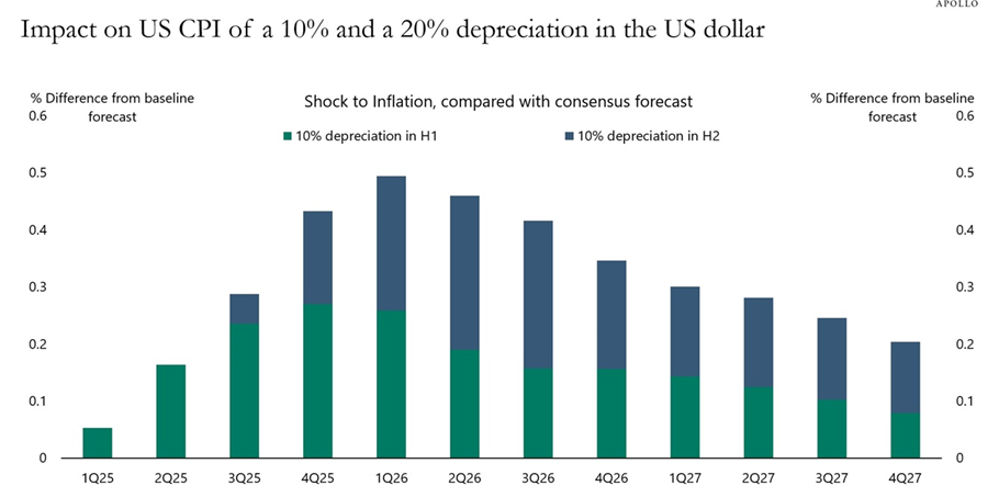 We don’t get CPI until next week on July 15, but again Bloomberg’s Authers rides to the rescue, citing Torsten Slok of Apollo Global Management. He uses something Bloomberg devised named a SHOK function, “which models the impact that changing different assumptions will have on the macroeconomy. Another 10% dollar depreciation in the second half should mean inflation 0.5 percentage points higher than expected, which would be disastrous.” The chart takes a few minutes to grasp. If we have it right, more depreciation means inflation a full 0.5% higher than what is now expected, or 0.5+2.4% (May) = 2.9%.