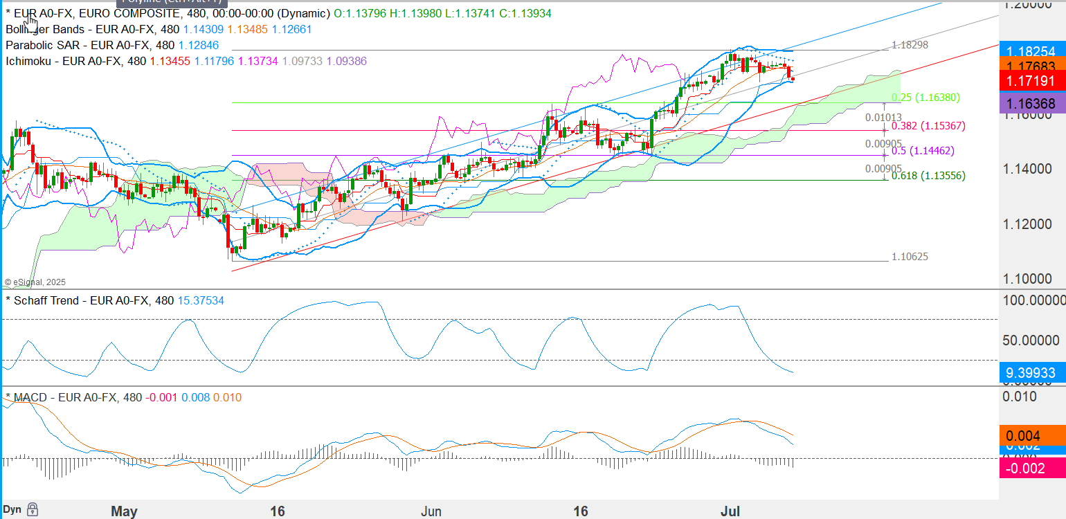 The ongoing correction has some easy targets—the 20-day at 1.1608, for example. But 20 days is too long when Trump is capable of throwing everything under the bus on any single day. See the 480-minute chart. The last low was 6/23 at 1.1453 and that’s a bridge too far. The halfway point of the lowest low is about 1.1636, which is also the 25% retracement line. This may well be the worst-case scenario.