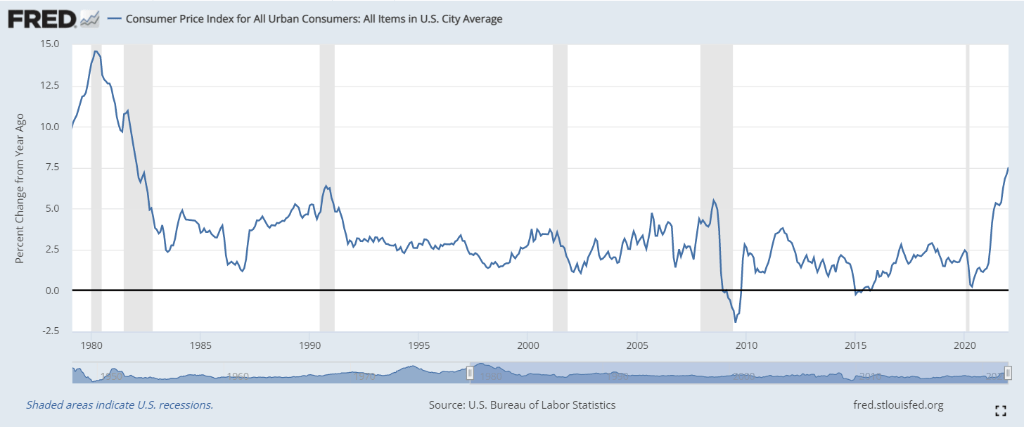 - Consumer Price Index jumps to 7.5%, core rises to 6%.