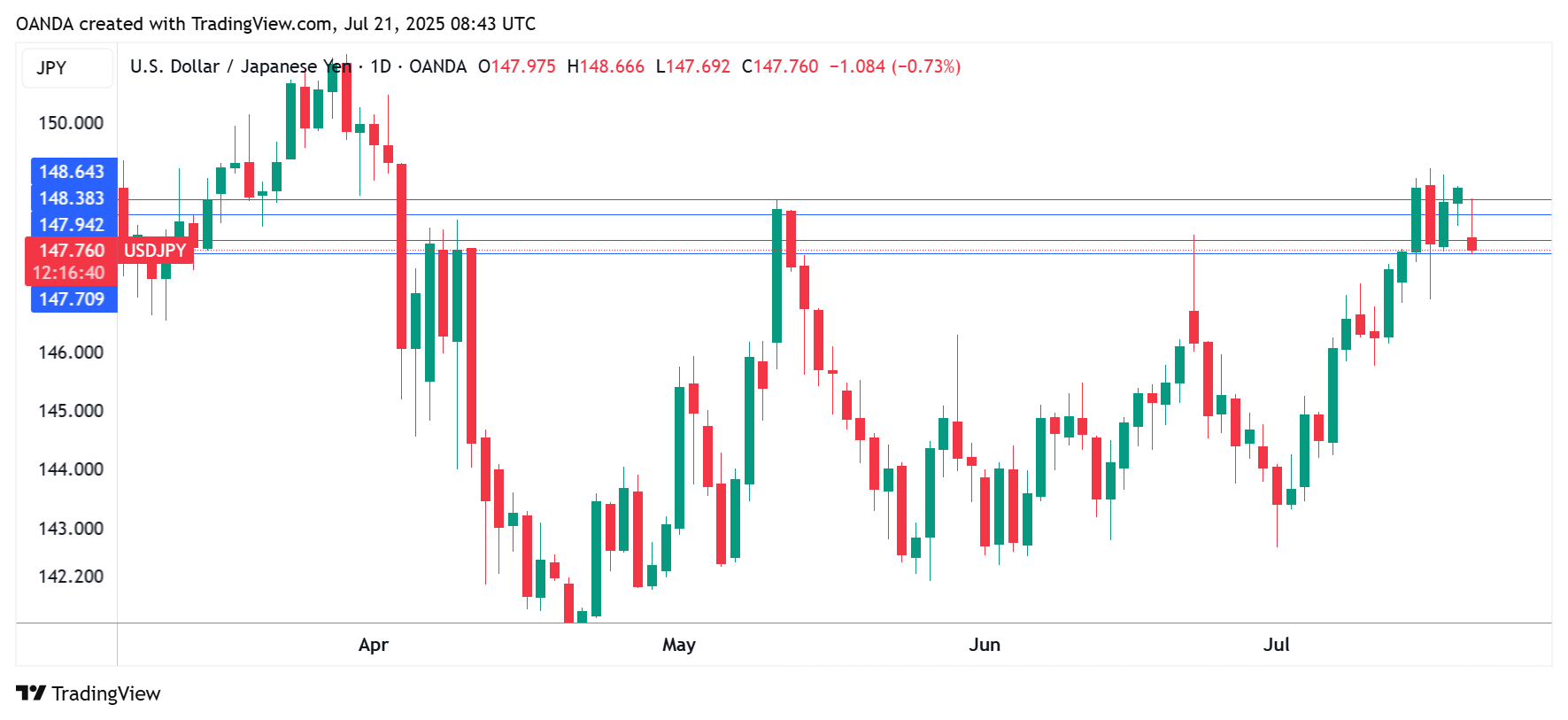 The Bank of Japan meets on July 31 and is widely expected to continue its wait-and-see stance on rate policy. The BoJ has been an outlier among major central banks as it looks to normalize policy and raise interest rates. However, with the economic turbulence and uncertainty due to President Trump's erratic tariff policy, the Bank has stayed on the sidelines and hasn't raised rates since January. Japan releases Tokyo Core CPI on Friday, the last tier-1 event before the rate meeting.