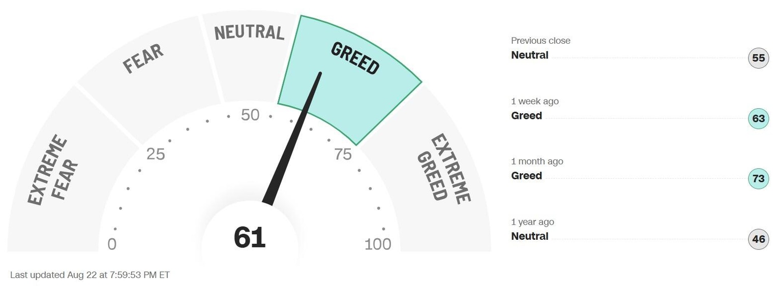 Sentiment gauges echoed the shift. CNN’s Fear & Greed Index climbed from neutral (55) to greed (61), reflecting a return of investor confidence.