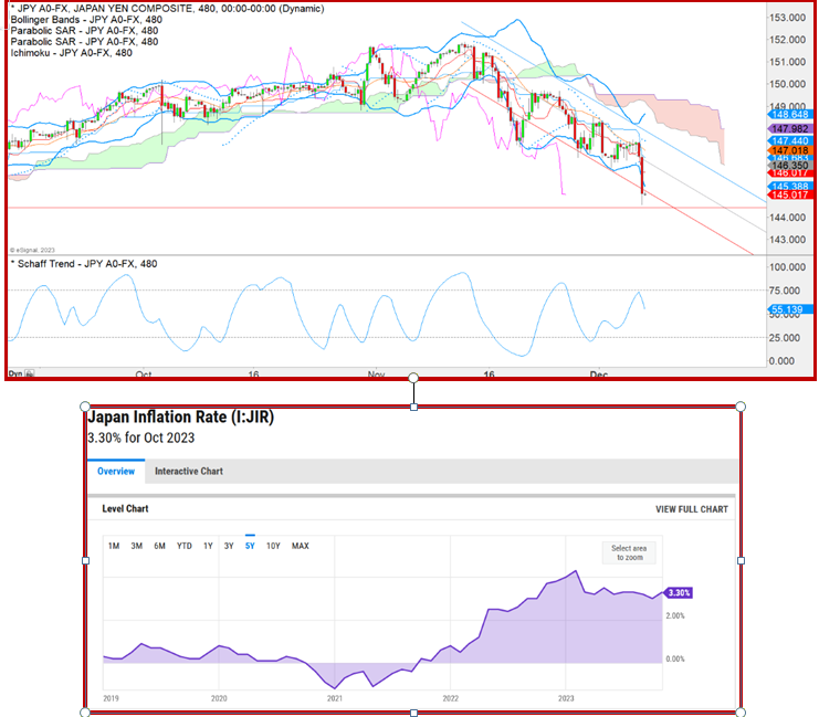The yen might be a distraction from the other currencies where central banks have a more conventional view of the inflation/interest rate relationship, but it could also be a cat among the pigeons—causing everyone to question the inflation mandate. Chief Ueda may be just giving lip-service to it since inflation has not fallen enough in Japan to justify talk of changing rates, at least not now (3.30% at the latest and moving down glacially). The inflation chart is from Y-Charts.
