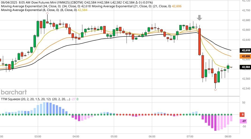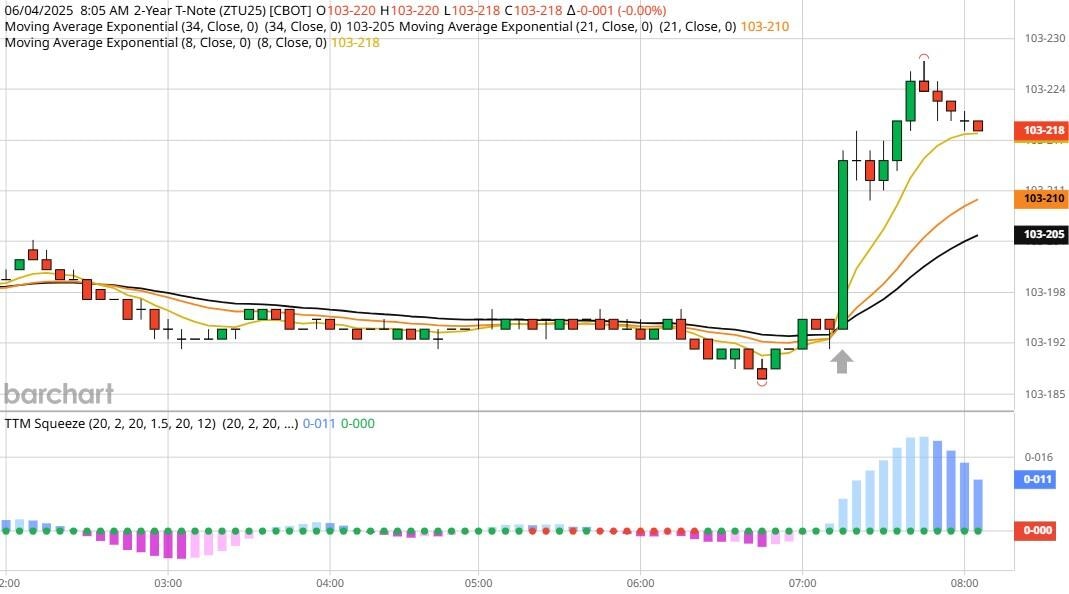 Yesterday the ZT climbed Higher at around 8:15 AM EST with Unemployment Claims pending. The Dow slide Lower at the same time. Look at the charts below and you'll see a pattern for both assets. The Dow moved Lower at 8:15 AM EST and the ZT climbed Higher at around the same time. These charts represent the newest version of Bar Charts, and I've changed the timeframe to a 15-minute chart to display better. This represented a Long opportunity on the 2-year note, as a trader you could have netted about 20 plus ticks per contract on this trade. Each tick is worth $6.25. Please note: the front month for ZT is now Sep '25 and the Dow is still Jun '25. I've changed the format to filled Candlesticks (not hollow) such that it may be more apparent and visible.
