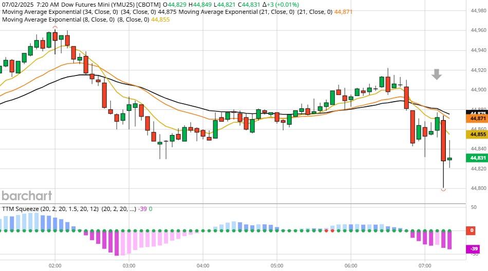 Yesterday the ZT leaped Higher at around 8 AM EST with the ADP Non-Farm Employment numbers. The Dow dived Lower at the same time. Look at the charts below and you'll see a pattern for both assets. The Dow dived Lower at 8 AM EST and the ZT climbed Higher at around the same time. These charts represent the newest version of Bar Charts, and I've changed the timeframe to a 15-minute chart to display better. This represented a Long opportunity on the 2-year note, as a trader you could have netted about 30 plus ticks per contract on this trade. Each tick is worth $6.25. Please note: the front month for ZT is now Sep '25 and the Dow is now Sep '25. I've changed the format to filled Candlesticks (not hollow) such that it may be more apparent and visible.