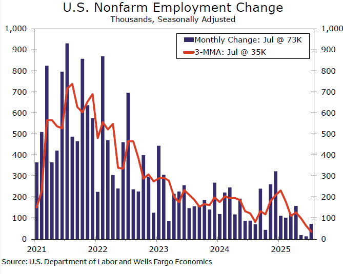 The "solid" state of the labor market described by the FOMC earlier this week looks more questionable after the July employment report. Nonfarm payrolls rose a weaker-than-expected 73K in July. More jarring, the below-consensus print came with the steepest downward net revision to the prior two months data (-258K) since May 2020. The three-month average of payroll growth was 150K coming into this report, and when incorporating revisions, the pace has lurched lower to just 35K.
