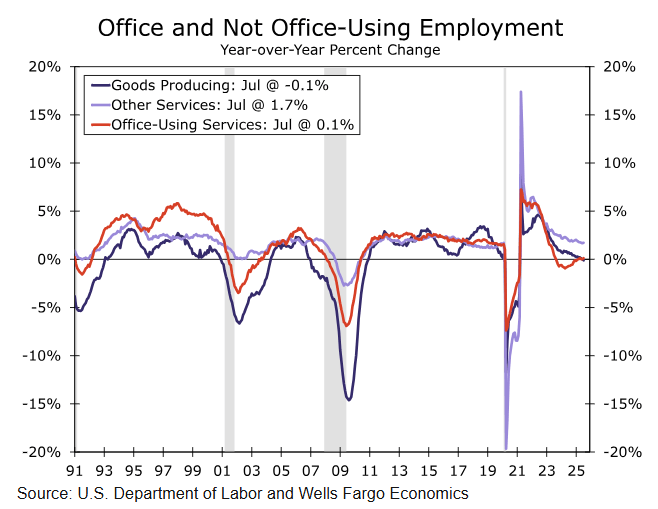 Hiring weakness across industries carried into July. The ongoing federal government hiring freeze pulled total government payrolls into the red in July (-10K), leaving employment down 84K since the start of the year (chart). Outside government, private sector hiring rebounded to a 83K gain, but the details continue to point to a narrow range of industries expanding headcount. Healthcare & social assistance (+73K) continues to be the stalwart of growth, but "white collar" jobs like professional & business services (-14K), information (-2K) and finance continue to struggle (chart). Goods related industries also remain under pressure, as shown by additional declines in wholesale trade (-8K) and manufacturing (-11K). The industry mix is illustrative of cyclically sensitive industries wobbling underneath the weight of stalling demand.